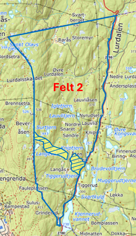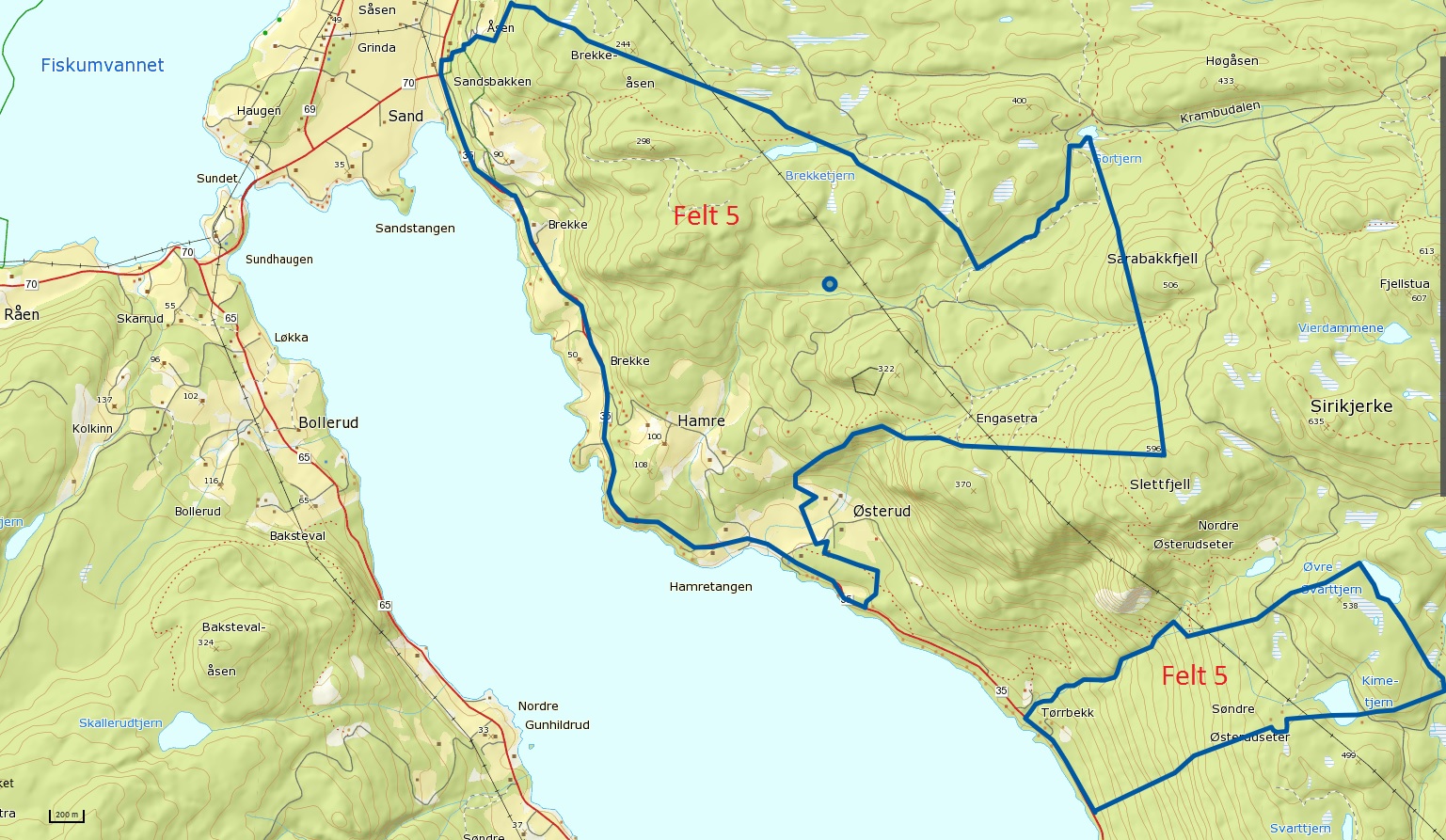 KartOmråde avgrenset med oransje er ikke del av Fiskum utmarkslag fom oktober 2019. Gjelder all type jakt, også storvilt.Skravert område er ikke del av Fiskum Utmarkslag jaktbare areal.Felt 5Skravert område er ikke del av Fiskum Utmarkslag jaktbare areal.